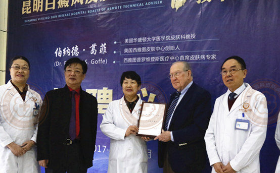 医院更借此机会,聘请伯纳德·葛菲教授为昆明白癜风皮肤病医院国际远程技术顾问,为葛菲教授颁发聘书。强强联合,保持国际领先医疗水平,致力为白癜风患者带来先进优质的白癜风诊疗服务。